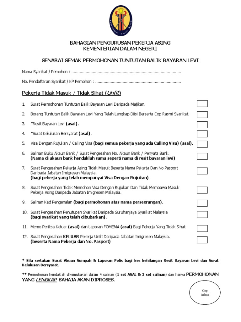 Borang Dan Senarai Semak Tuntutan Semula Levi Pekerja Asing Biasa