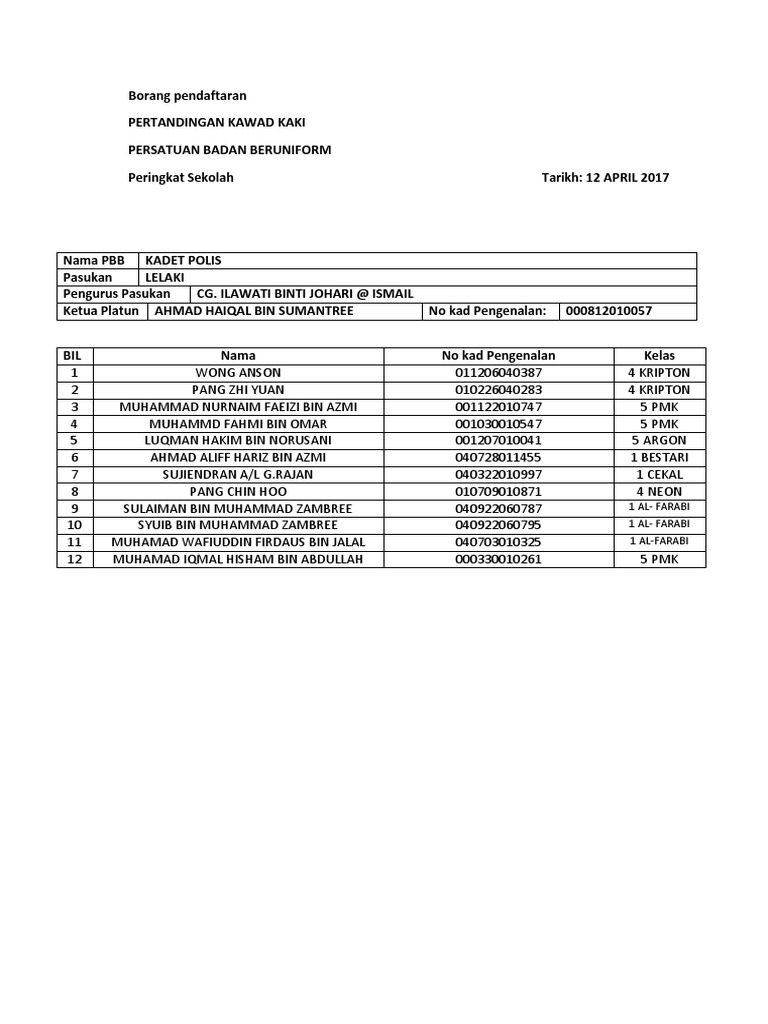 Borang Pendaftaran Pertandingan Kawad Kadet Polis 2017 Docx