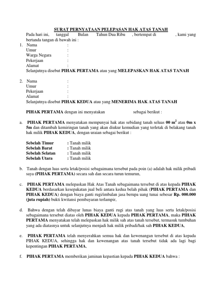 Surat Pernyataan Pelepasan Hak Atas Tanah Docx Document