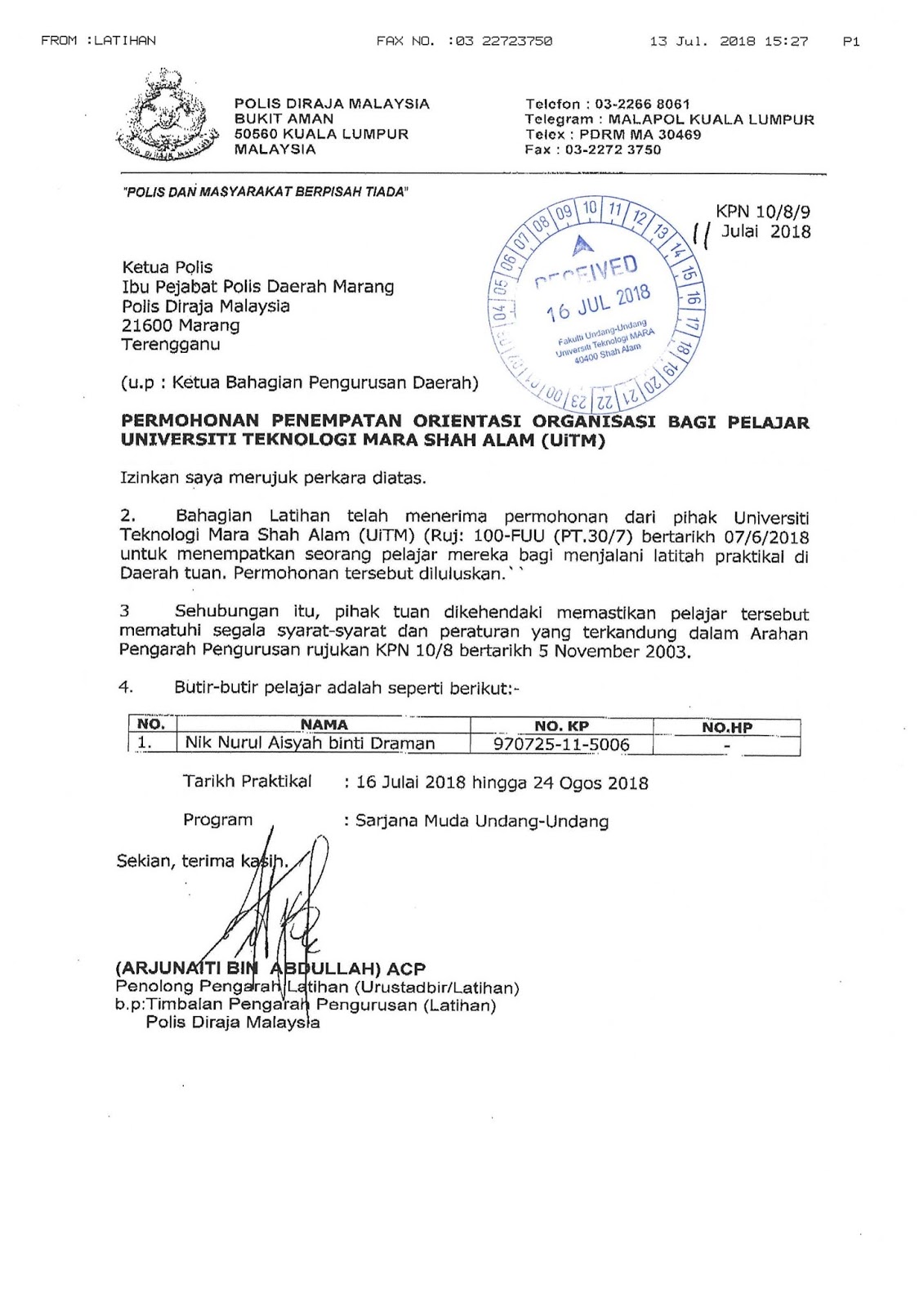 Latihan Industri Fuu Surat Penerimaan Daripada Balai Polis Firma Guaman Jabatan