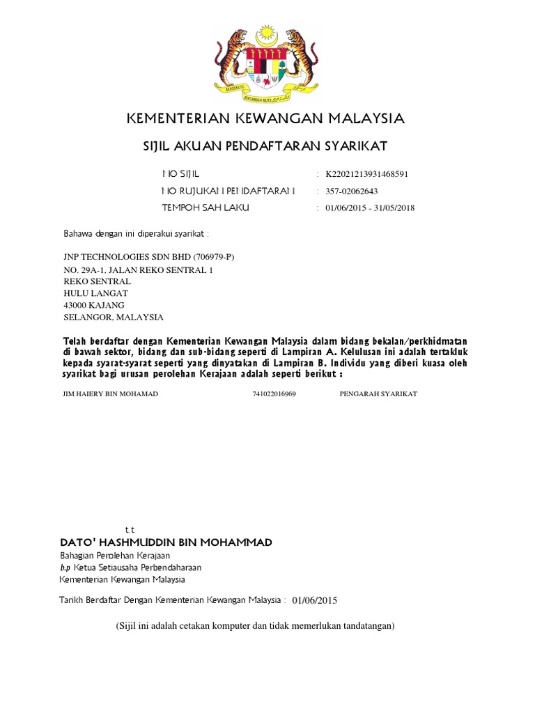 Kementerian Kewangan Malaysia Sijil Akuan Pendaftaran Syarikat Bumiputera