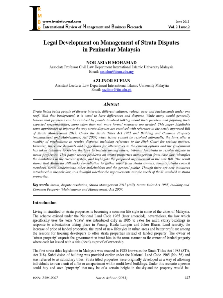 A Legal Perspective On Development On Strata Management In Peninsular Malaysia A Review Of The Strata Titles Act 1985 Up 054 Iium Repository Irep
